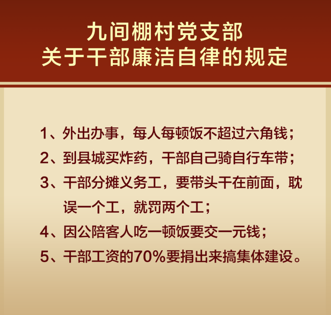 走到黨支部的“五項規定”前,他拿起手機拍了。走了又回過頭來,大概沒有拍好,又拍了一張。我向他介紹這是九間棚在1986年定的“五項規定”。